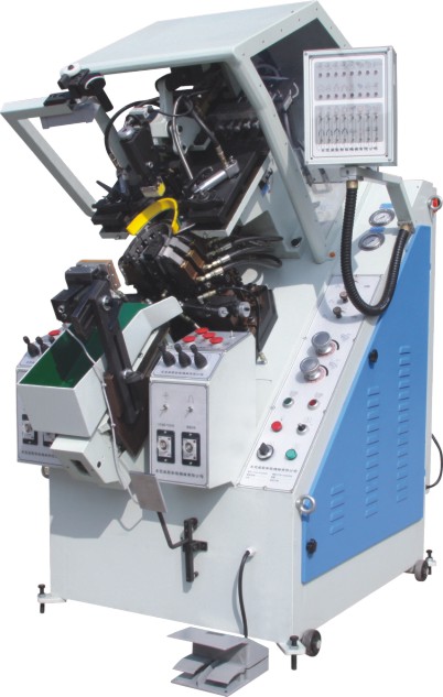 3. 后踵部份可提前上升,防止鞋楦后滑(俗稱跑中底)V型后踵頂板,配合3支束緊油缸,確保在結幫時楦頭不會左右擺動,后跟,鞋面接口針眼處不會有膠溢出,使后跟更加圓順。