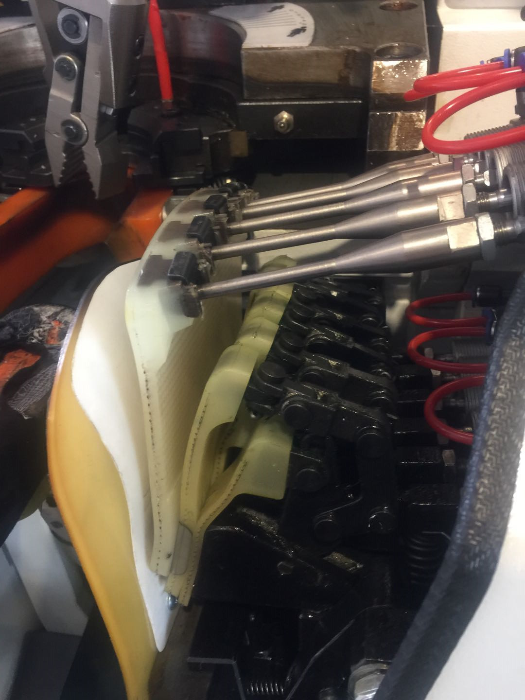 7. 內(nèi)外腰各配備一支夾鉗,夾鉗夾緊鞋面后再向內(nèi)拉緊,使內(nèi)腰鞋面貼緊鞋楦,達(dá)成好的結(jié)幫效果。