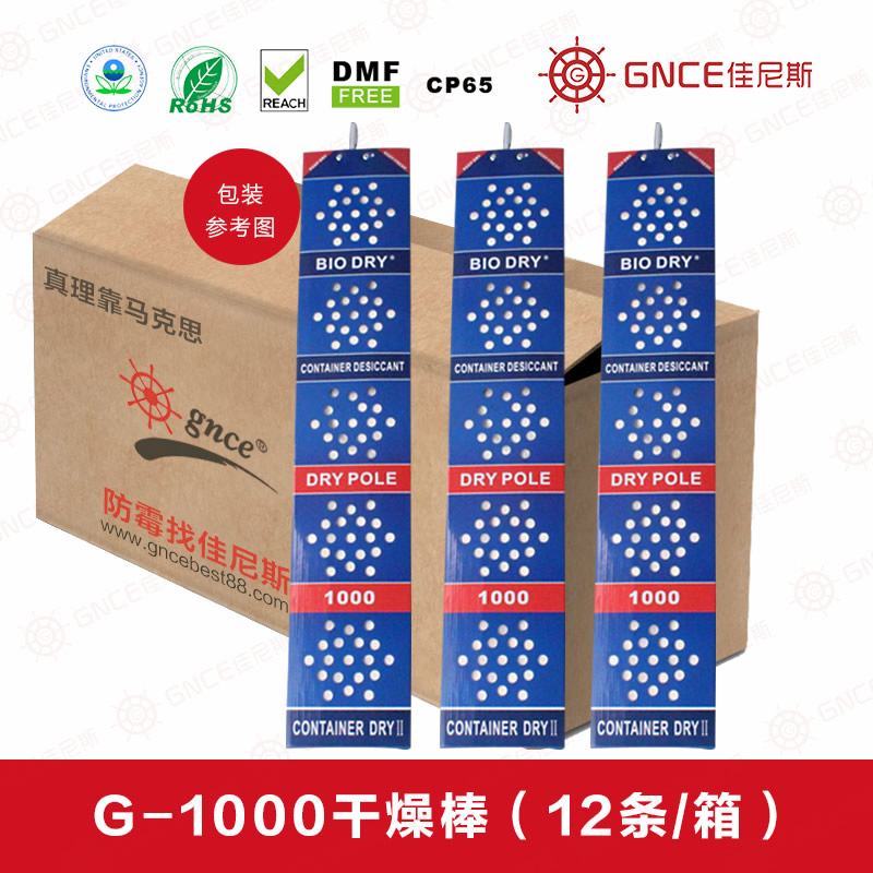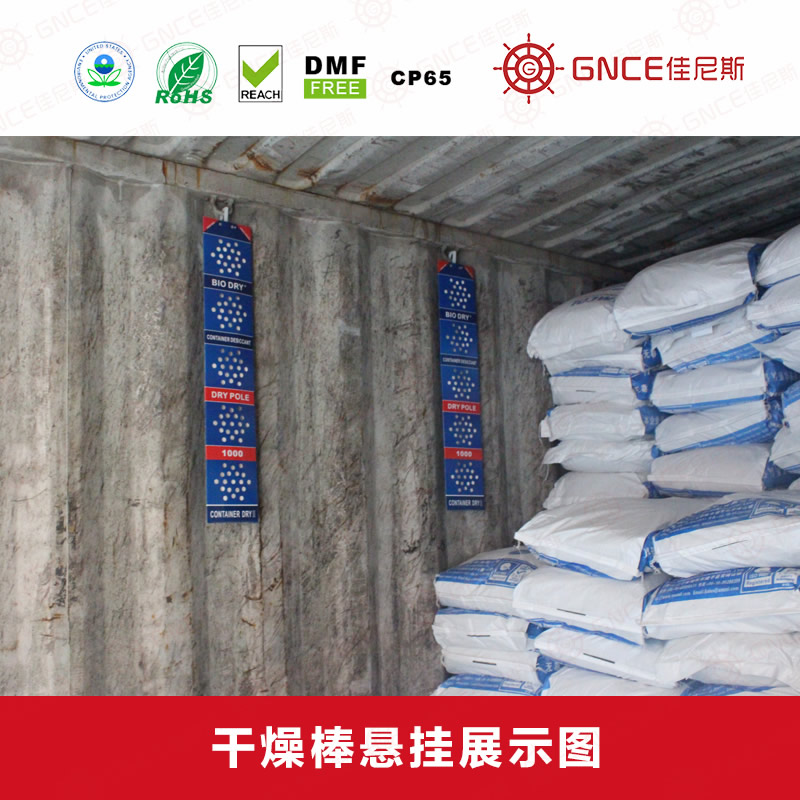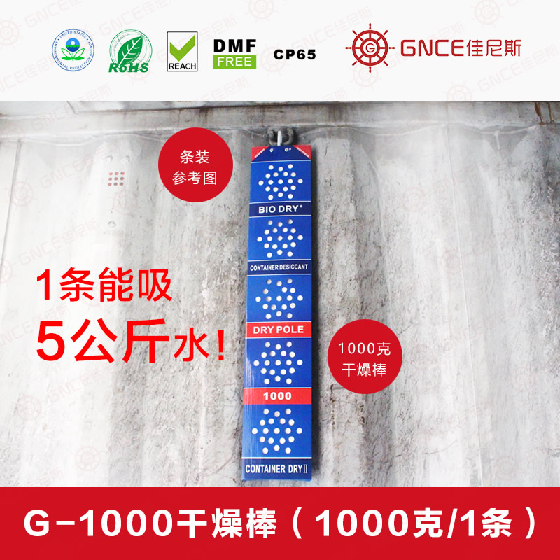 特點簡介:集裝箱干燥棒G-1000用于集裝箱防潮,防止產(chǎn)品因海運時受潮而出現(xiàn)發(fā)霉、變質(zhì)現(xiàn)象。出口貨物在運輸過程中,特別是海運途中,晝夜溫差較大,容易形成凝露現(xiàn)象(俗稱“貨柜箱雨”和“貨物汗”),這一現(xiàn)象容易導致產(chǎn)品發(fā)霉。其最大吸附水蒸汽的量可達到自身的200%,是普通硅膠吸水倍率的10-20倍。包裝材料采用吸濕性強的材料,韌性好、抗刺穿、耐腐蝕,無返滲。集裝箱干燥棒符合相關(guān)環(huán)保要求,經(jīng)過Reach、包裝指令94/62/EC、Rohs、不含DMF等相關(guān)環(huán)保檢測認證。