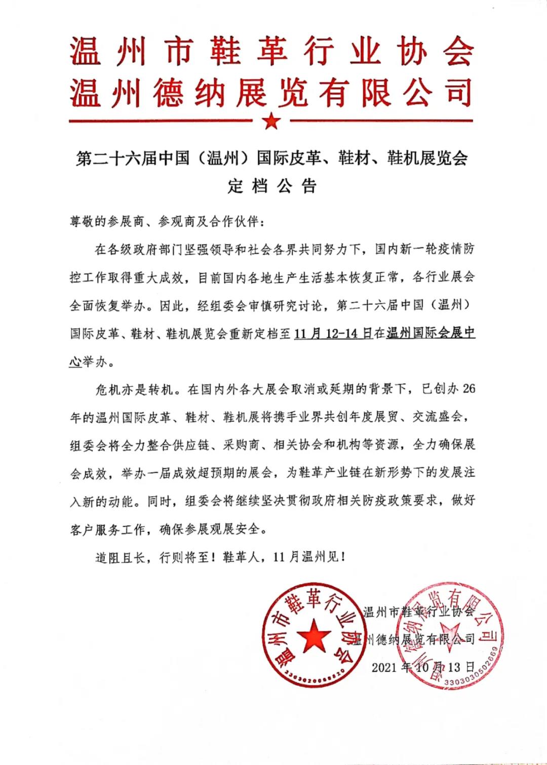 定檔!| 第二十六屆中國(溫州)國際皮革、鞋材、鞋機(jī)展檔期最終確定